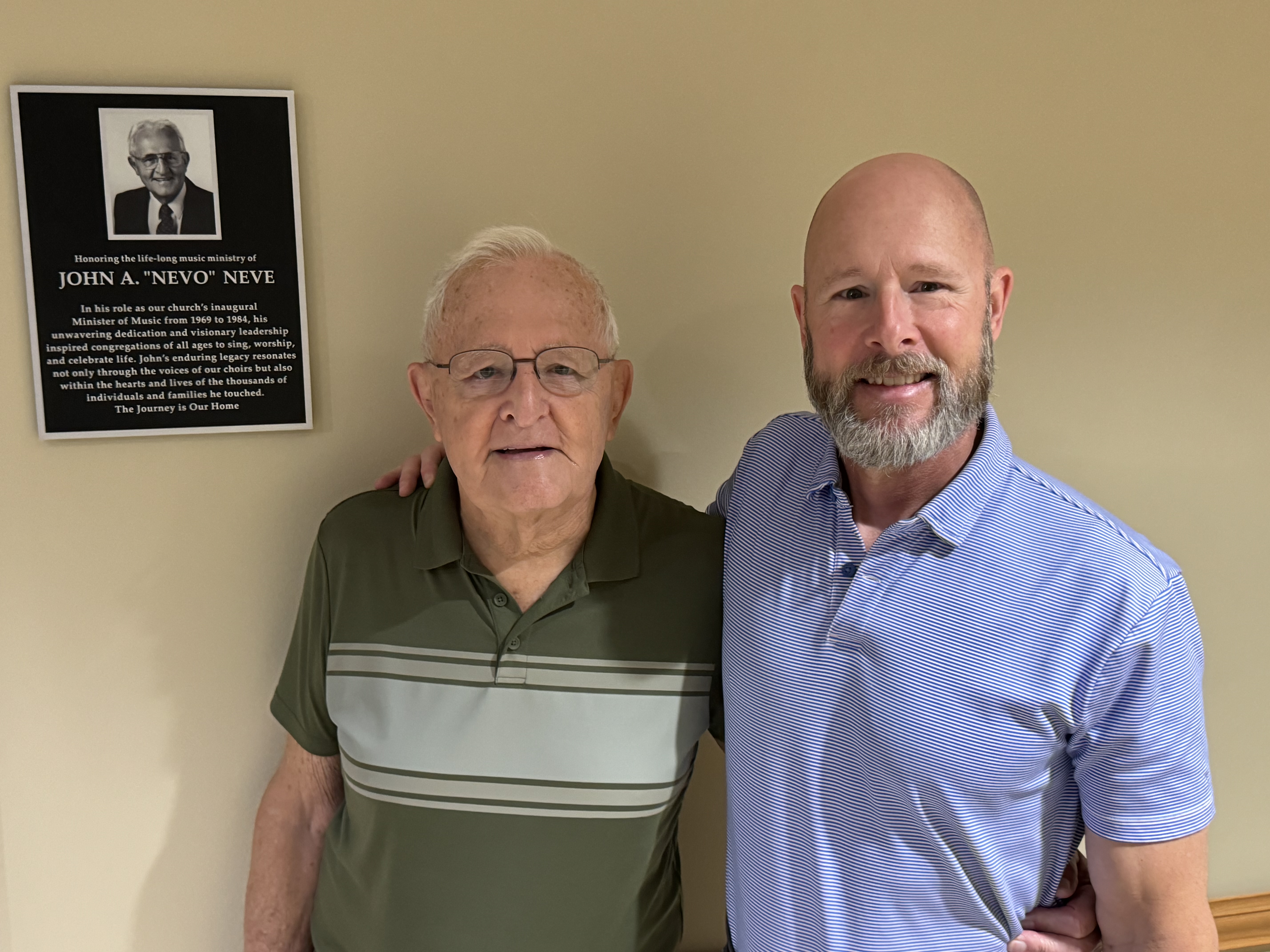 In response, the church agreed to create the Downers Grove First United Methodist Church Music Ministries Hall of Honor and to make Nevo -- the father of this legacy -- as its first inductee. The plaque that now hangs outside Chapel Hall recognizes that even now, Nevo continues to have an impact upon our church and its members, inspiring a new tradition of recognizing those who have continued to build upon his foundational work.